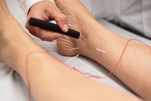 A electroestimulação consiste na aplicação de TENS, uma corrente elétrica, na agulha de acupuntura que provoca uma sensação de formigueiro e que ajudará no alívio da dor e a potenciar o efeito dado pelas agulhas em outros casos.