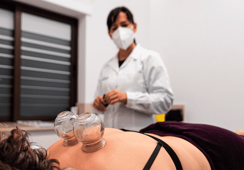 A ventosaterapia aplicação de ventosas, uma espécie de copos, geralmente de vidro, onde é criada uma sucção da pele provocada por vácuo, melhorando a circulação local.
